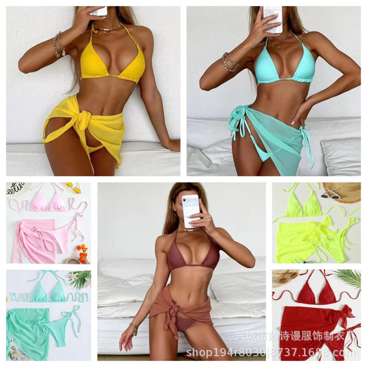 European And American Foreign Trade New Solid Color Triangle Cup Lace-up Bikini Three-piece Set