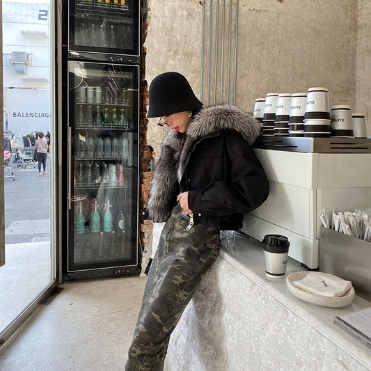 Wool Collar Fitted White Duck Down Warm Leather Coat