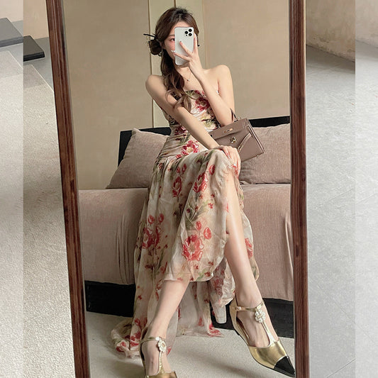 Trägerloses, langes Kleid mit Blumenmuster für Damen