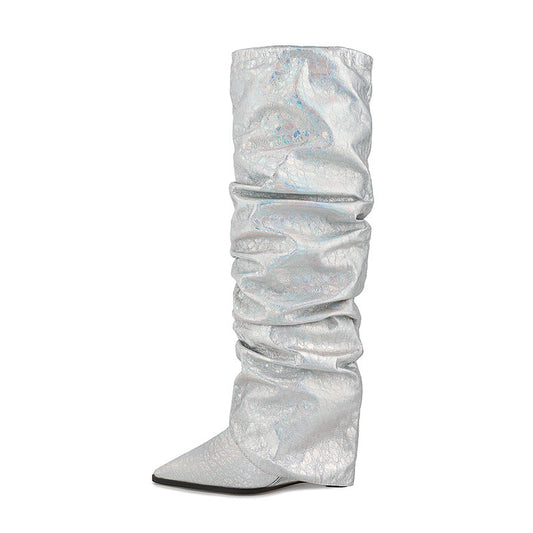 Bota de mujer de caña alta con pliegues y mangas con costuras en punta
