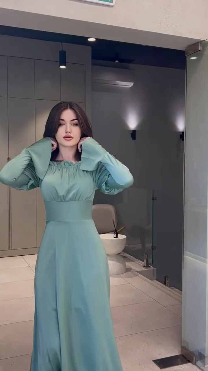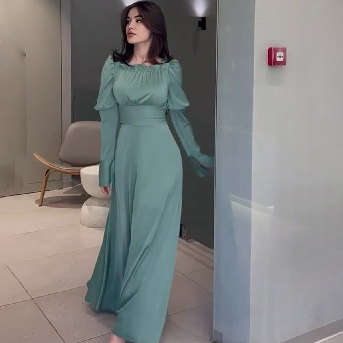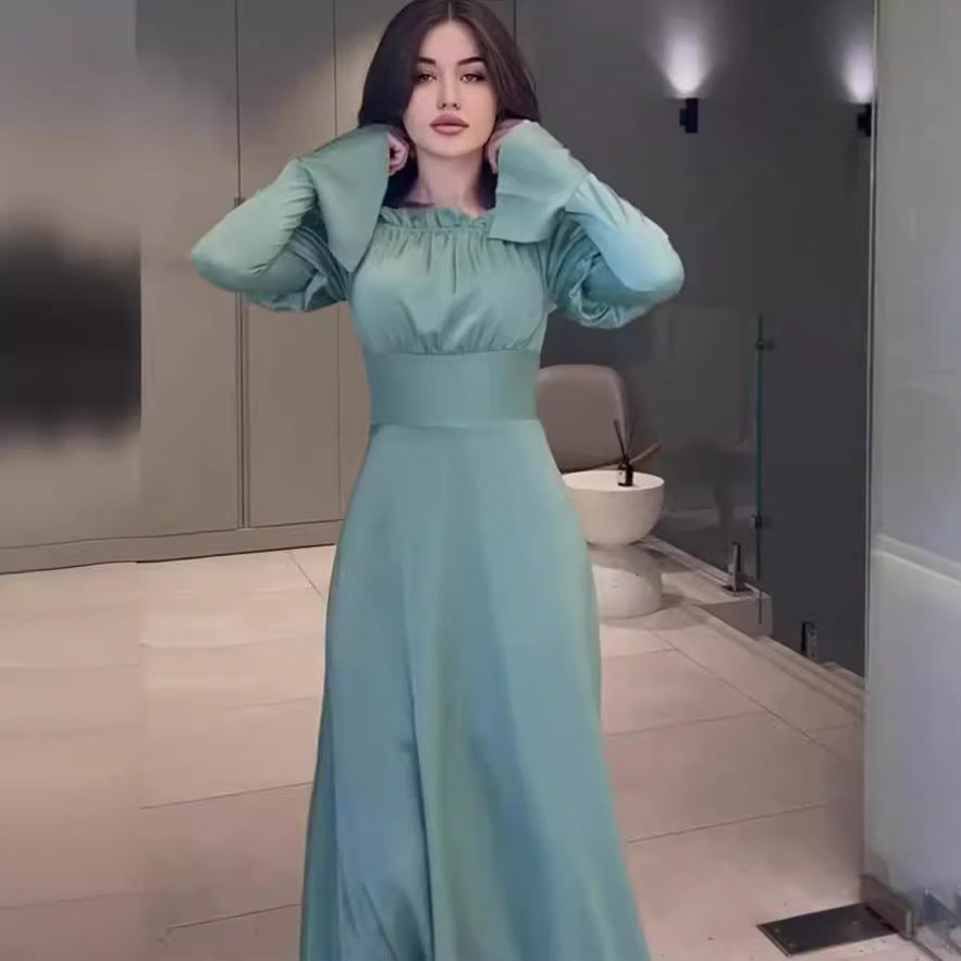 Vestido de manga larga de color liso ajustado con cintura con orejas de madera y cuello de burbuja