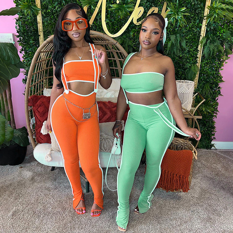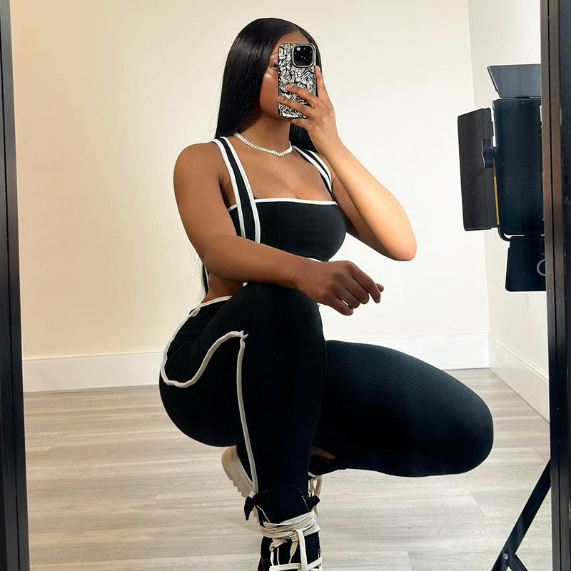 Color Matching Sunken Stripe Suspender Pants Sports And Leisure Suit