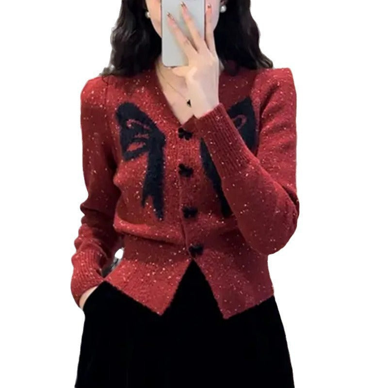 Suéter de punto con lazo y cuello en V Suéter de manga larga