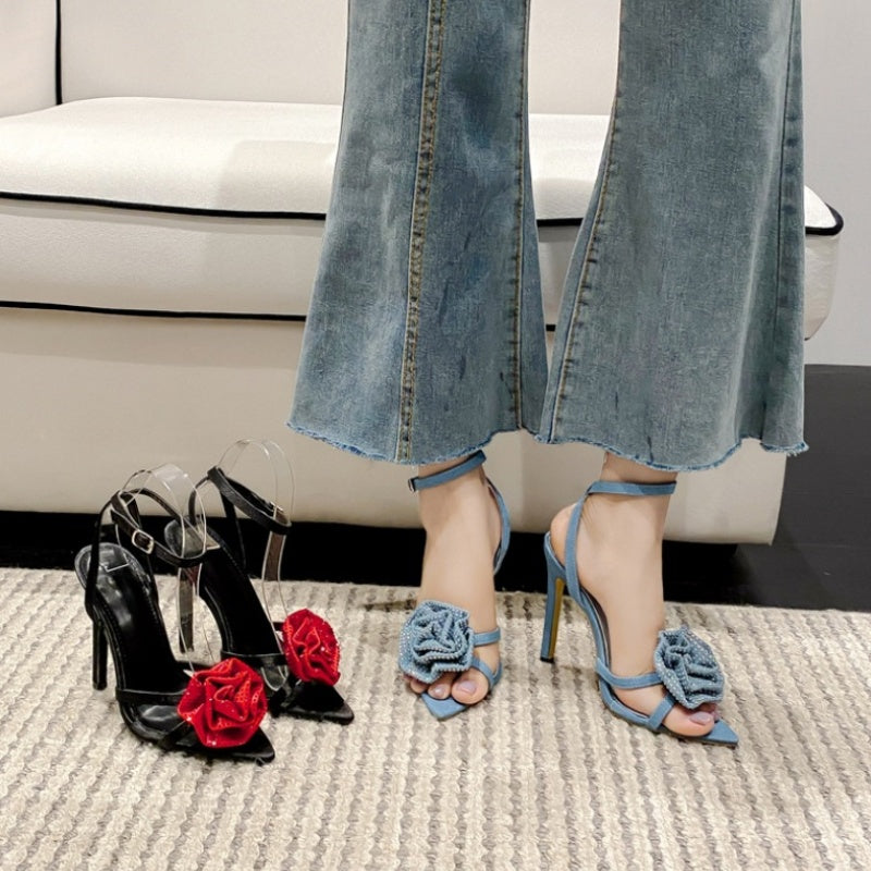 New Women's Shoes Pointed Toe Rhinestone Flower Strap Stiletto Heel Sandals