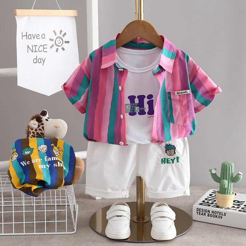 Boys' Color Stripes Lapel Shirt Short Sleeve Three-piece Suit