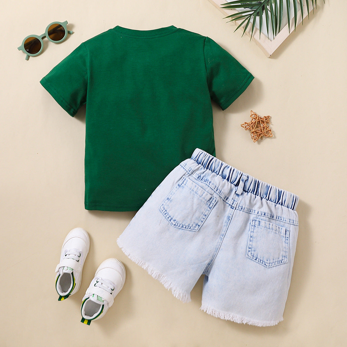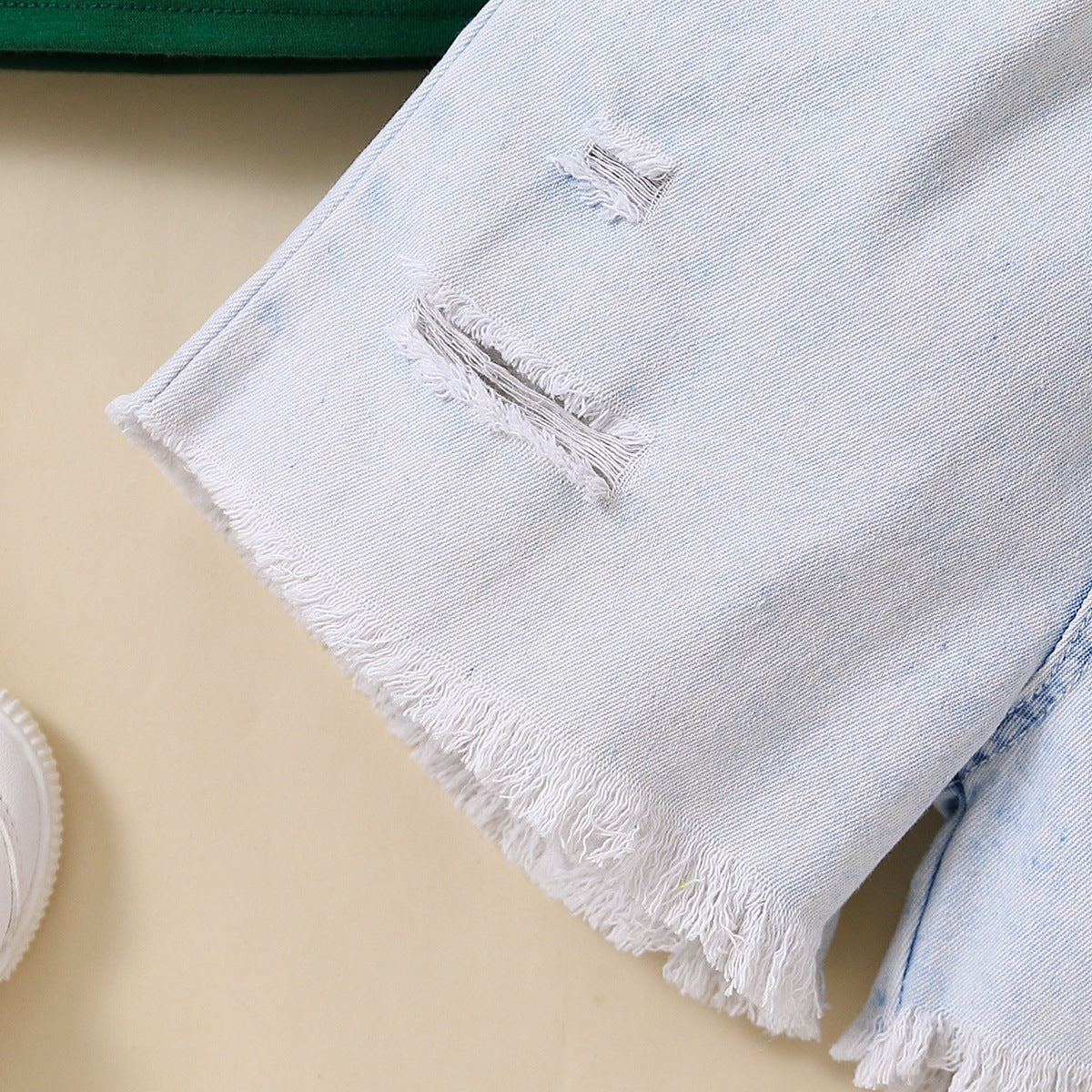 Children's Letter Short Sleeve Denim With Hole Shorts Suit
