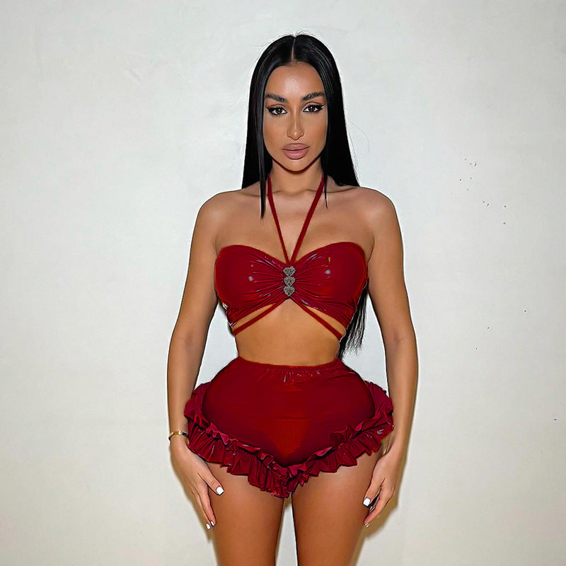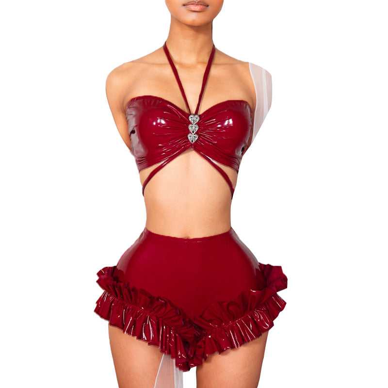 Heart-shaped Halter Wrapped Chest PU Leather High Waist Shorts Suit