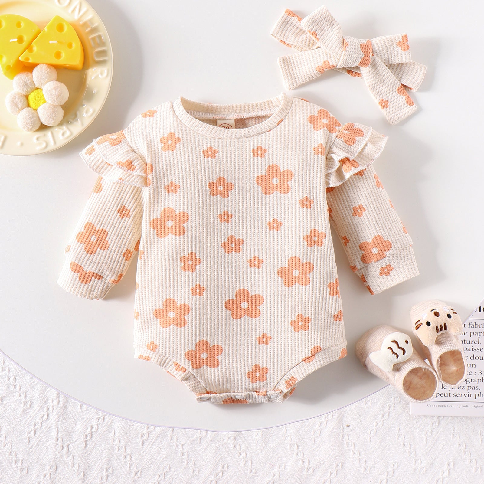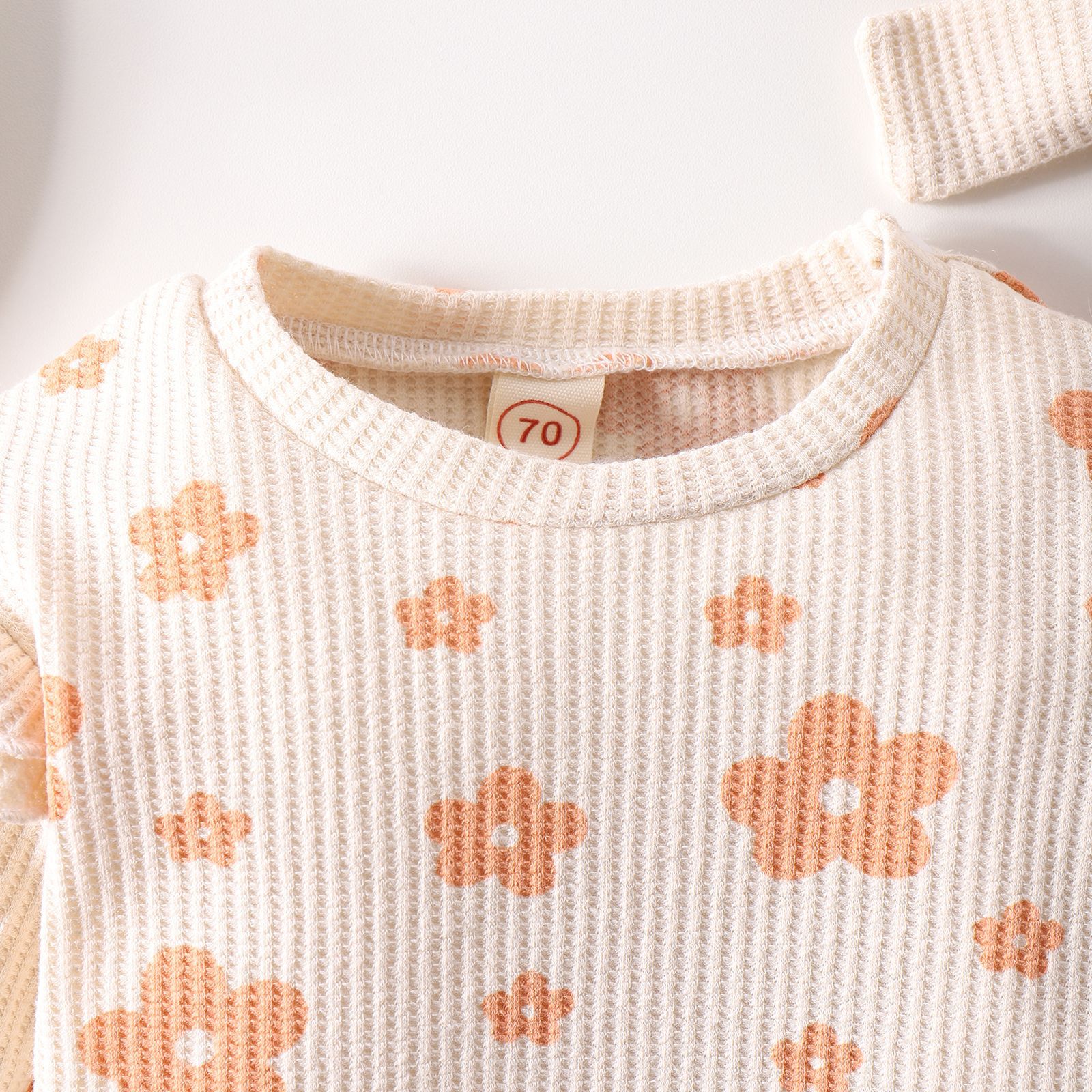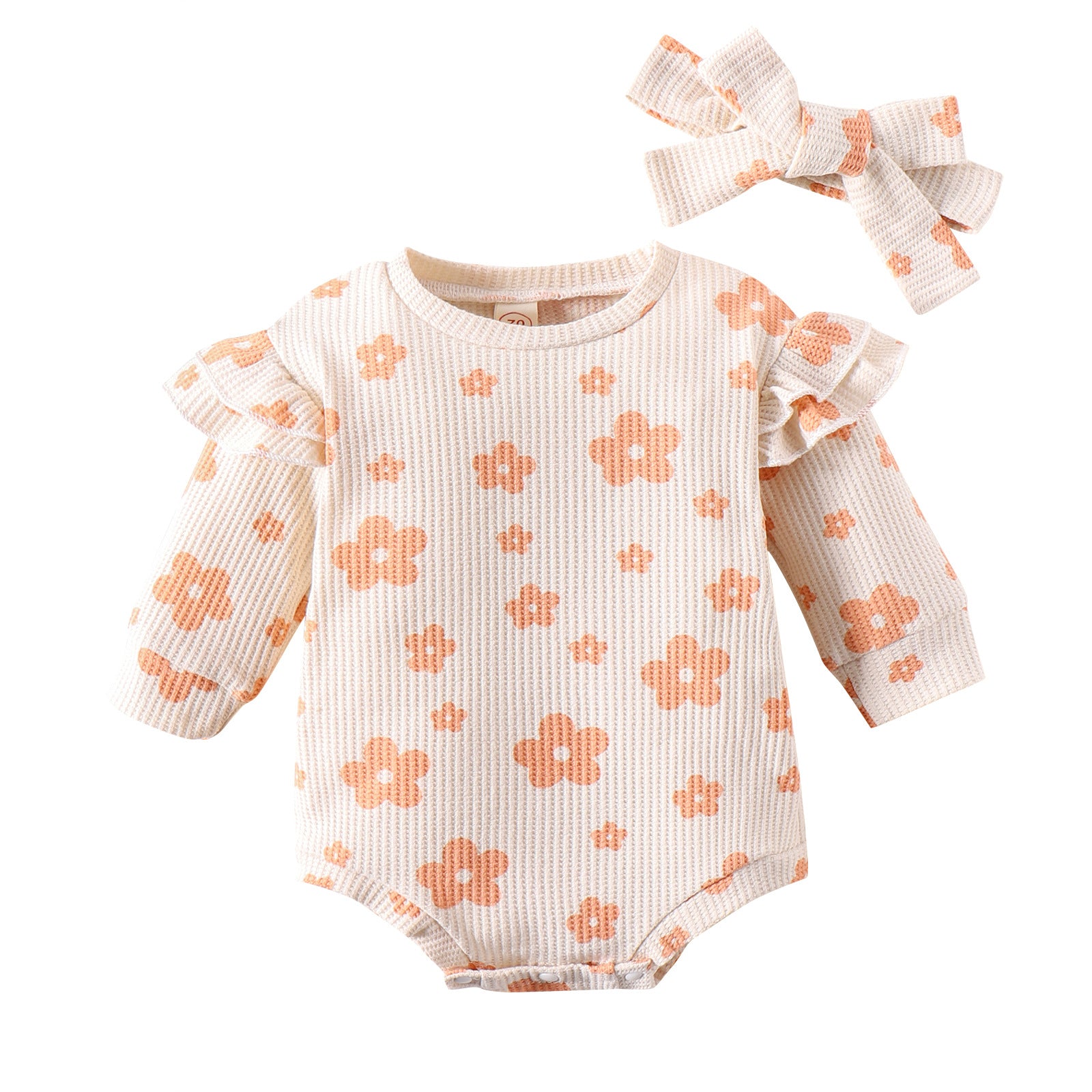 Solid Color Waffle Print Romper With Bow Suit
